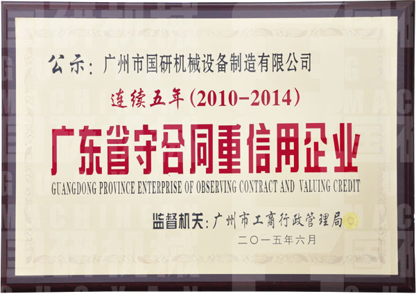 “连续五年(2010-2014)广东省守合同重信用企业”的牌匾在广州市乐竞网页版登录入口设备制造有限公司的文化展示墙上格外引人注目,这是对公司多年坚持诚信经营的充分肯定,也是公司企业文化“诚信、创新、分享、精进”的客观体现。